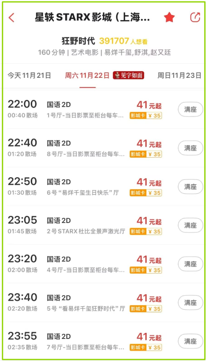 从上海某影城的排片来看,从晚上十点到十二点期间,一共有7场,场场爆满。周末的这个时间点,有一场满座还算正常,但场场都是满座,显然是有问题的。