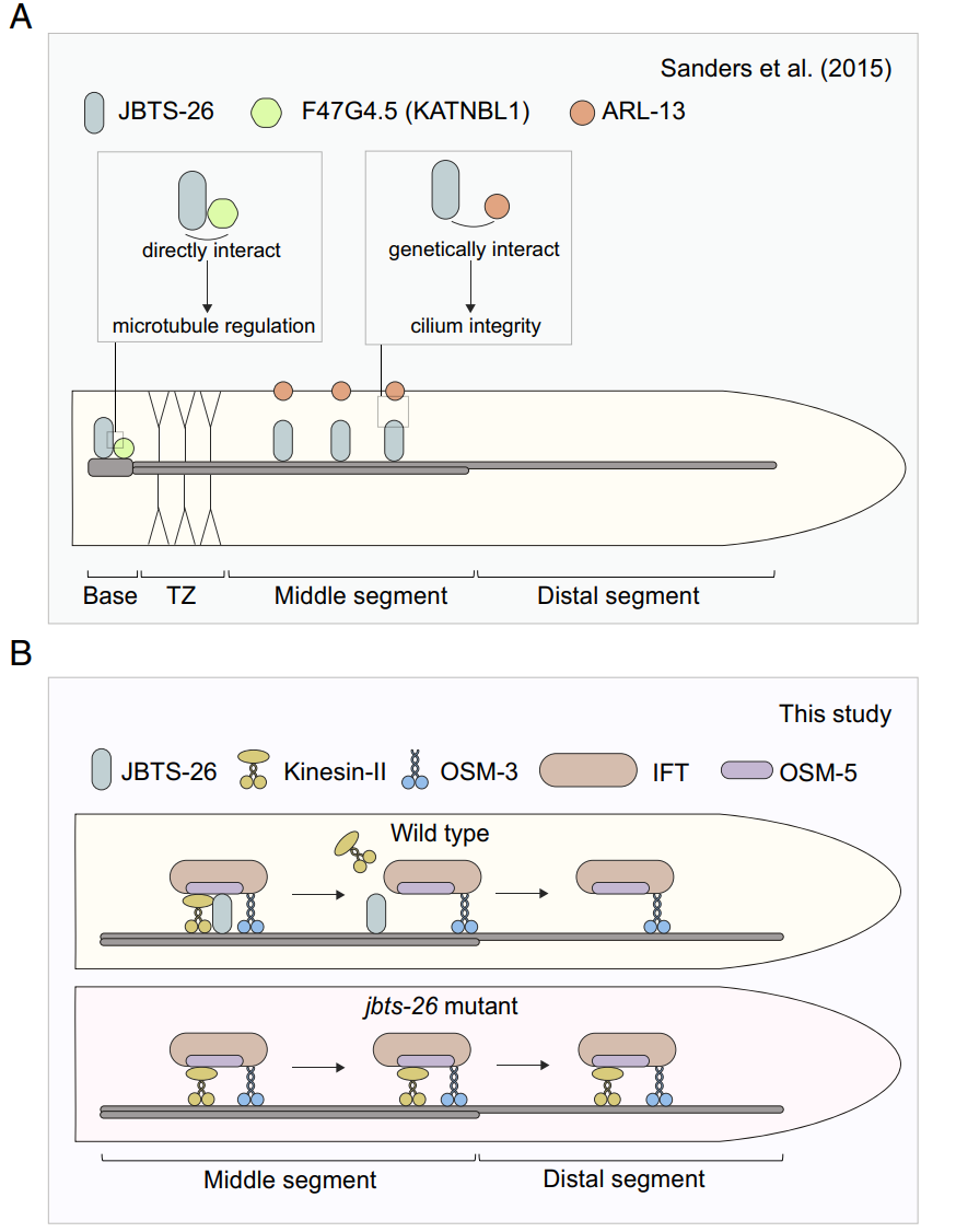 秀丽隐杆线虫是阐明Joubert综合征突变机制的模式生物。本文中,作者揭示了Joubert综合征26型蛋白(JBTS-26,先前命名为K04F10.2)在调控驱动蛋白-II区域运动性中的作用。作者证明JBTS-26特异性结合于纤毛中间段的双联微管,并直接与IFT颗粒亚基OSM-5/IFT88相互作用。引人注目的是,JBTS-26与KAP-1竞争结合IFT颗粒,从而将驱动蛋白-II从马达-货物复合体中置换出来。这一机制将驱动蛋白-II的运动性限制在中间段,确保了向OSM-3的正常马达交接。作者的研究结果阐明了JBTS-26在纤毛运输中作用的分子机制,并为理解驱动蛋白马达空间调控缺陷如何导致如Joubert综合征等纤毛病提供了见解。