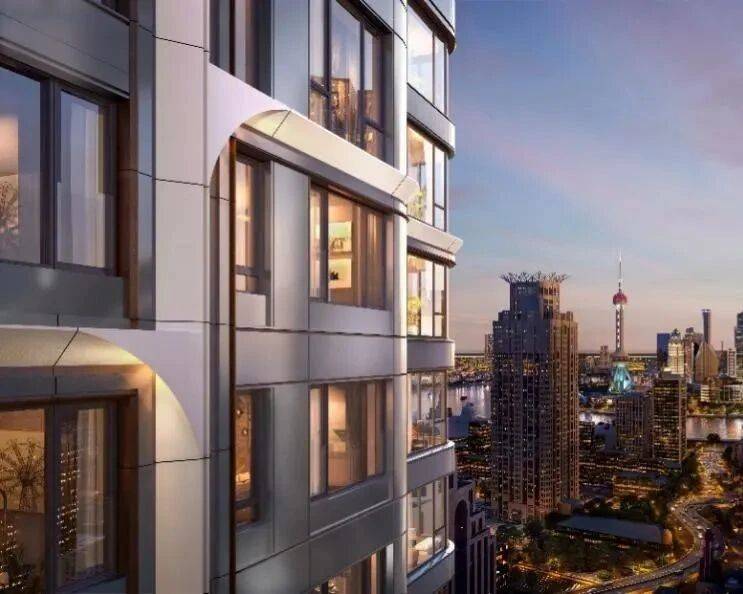 项目规划有4栋150米超高层住宅和少量石库门风貌别墅,主力户型为建面约360-875㎡的云端大宅,均价约20.5万元/㎡,总价8203万元起。户型设计极为高端,采用三梯两户、中西分厨、270°观景窗等配置,确保每一户都能享受到极致的采光和视野。建筑立面以珍珠白铝板勾勒“竹节”脉络,香槟金金属线条复刻竹子肌理,夜晚灯光下宛如“外滩竹影”,与城市天际线相映成趣。