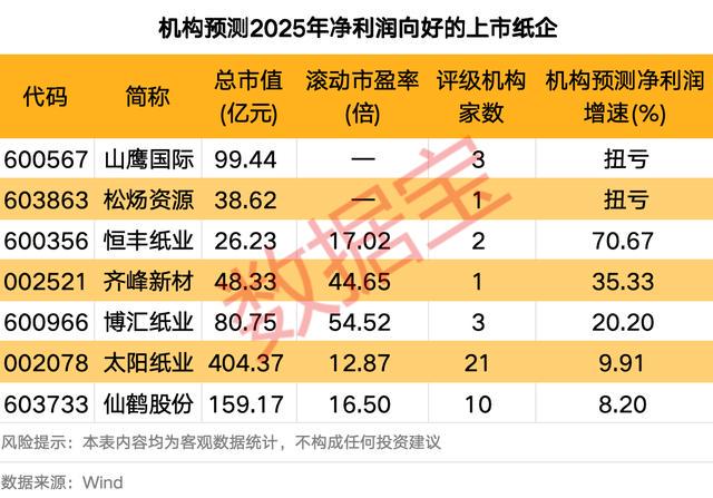 根据机构一致预测,恒丰纸业、齐峰新材、博汇纸业3股在去年同期盈利基础上,2025全年净利润增速居前,依次为70.67%、35.33%、20.2%;山鹰国际、松炀资源全年则有望实现扭亏为盈。