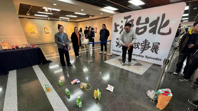 在开幕式后,嘉宾们纷纷来到展厅参观,人气最高的项目,竟是一个套圈圈游戏。和寻常市集娱乐项目一样,策展方在地上摆放了一些饮料、零食之类的奖品,参加者需在五米开外掷圈,套中即可赢得奖品。看到熟悉的套圈圈,两岸嘉宾们来了兴致,纷纷上前尝试,有人手气不错赢得奖品,但大多是空手而归。一位台湾嘉宾告诉记者,这个游戏每一个台湾人基本是从小玩到大,几乎所有夜市都能看到,每次都套不到,但下次又忍不住尝试,可以说是“满满辛酸泪”。