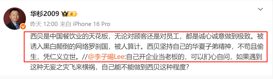 今天的热搜大家也都看到了。起因是昨天媒体报道西贝恢复了事件前的客流,然后华与华老板华杉发了条微博,捧了捧主子。