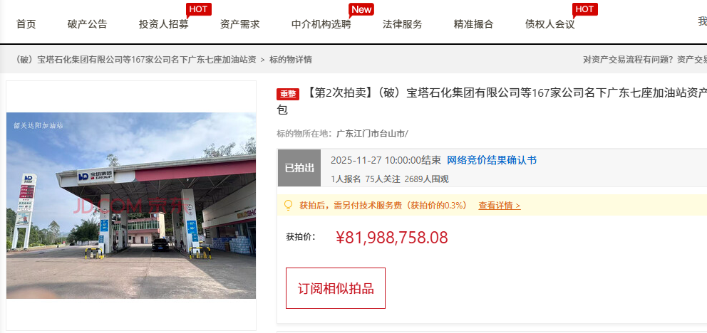 此次广东拍卖的加油站,是跟破产公司有关,拍卖的是宝塔石化集团有限公司以及关联的167家公司整体破产有关的加油站资产拍卖。宝塔石化集团有限公司曾经是宁夏一个非常有实力的石化企业,可惜已经破产了。宝塔石化集团有限公司在广东有不少分公司,然后在广东多地投资建设了不少加油站,此前其在深圳市的两个加油站已经被拍卖了。