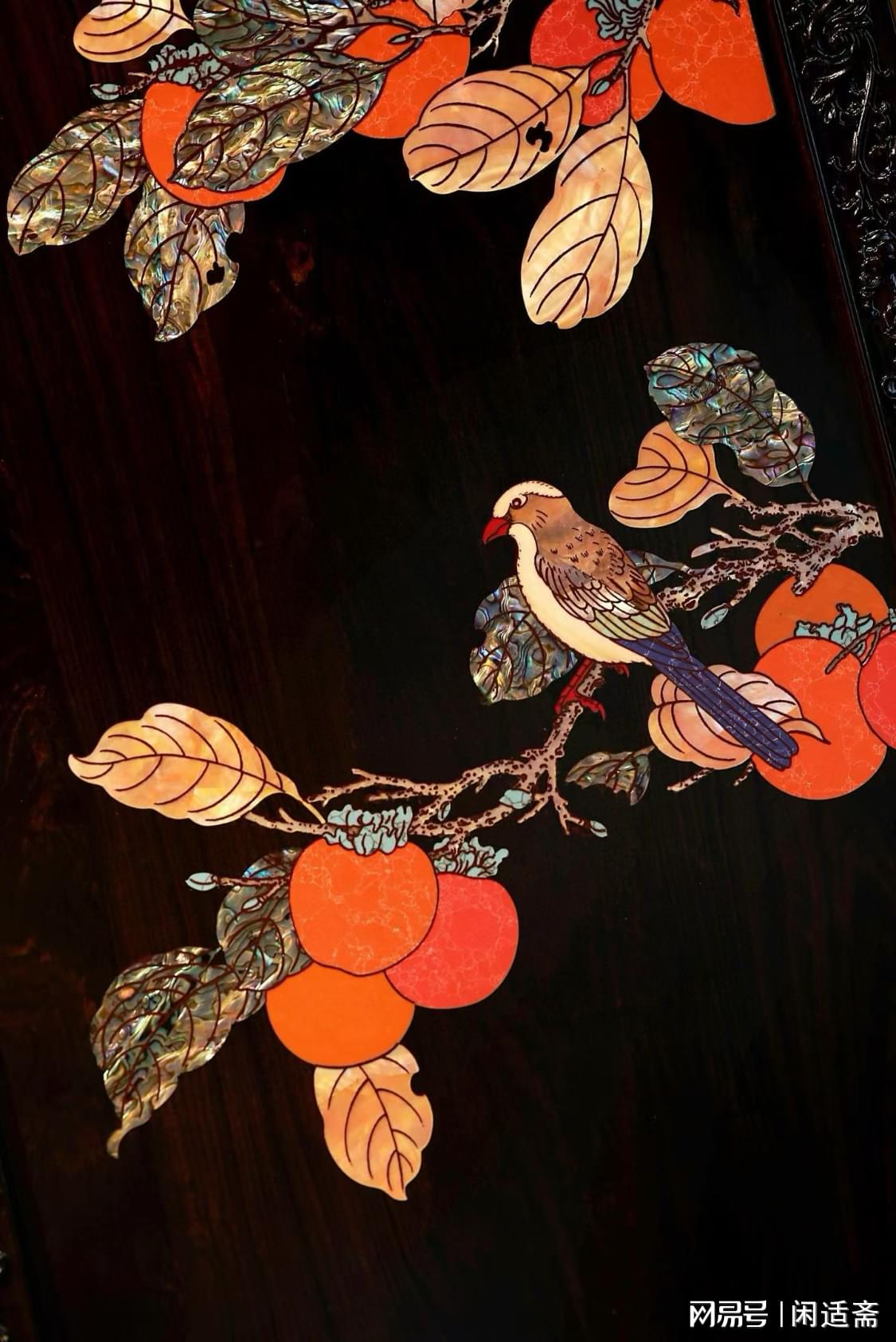 右侧“事事平安”主题则以温暖色调传递吉祥寓意,匠人巧用螺钿的天然色泽,将柿子果实雕琢得饱满诱人。橙红与朱红的螺钿层层叠加,模拟出柿子成熟的色泽渐变,果蒂以深褐螺钿点缀,细节逼真;枝干以紫光檀本身的纹理呈现,线条遒劲有力,几片绿叶以翡翠色螺钿镶嵌,与橙红的柿子形成鲜明对比,更显生机盎然。“柿”与“事”谐音,“事事平安”的美好祈愿便随着这挂满枝头的红柿传递出来,“柿红挂枝时,便携‘事事平安’意”的祝福质朴而真挚。