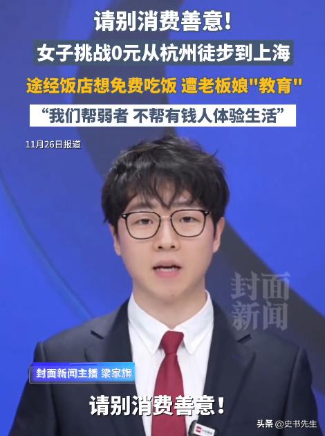 河北一女子自主挑战从杭州徒步到上海的“零花费挑战”,不料却在被过路饭店老板娘“打脸”。