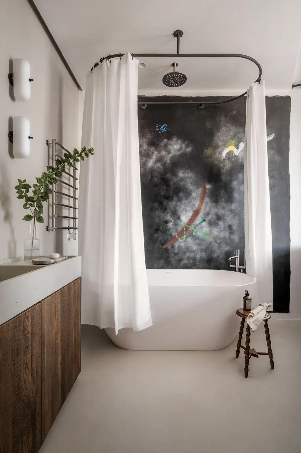 这个家有两个卫生间。连着主卧的主卫,装了一个时尚的木制洗手台、壁挂马桶,还有个显档次的独立浴缸。灰色的地砖和温暖的灯光保持了统一的调调。设计师又在这里展示了她有点特别的装饰品味,做了一面超酷的手绘黑色主题墙。
