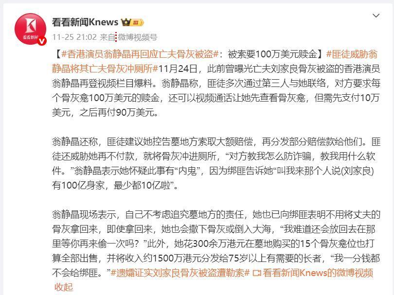 11月24日翁静晶再曝猛料,绑匪通过第三人找上门了,一开口就刷新认知下限。先是报价:每个骨灰龛要100万美元赎金,还 “贴心” 推出分期付款方案 —— 先付10万美金能视频验货,确认是真骨灰再付90万尾款。