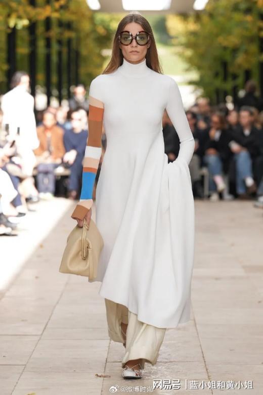 CELINE本季聚焦于经典款的再创作,通过材质与色彩的创新搭配,赋予基础单品全新生命力。牛仔系列选用“夏日雾蓝”色调,裤脚不规则毛边与米色亚麻领口的拼接,营造出自然和谐的视觉效果。针织单品则运用色彩渐变与细节装饰,如米白色连衣裙,裙摆垂坠如湖面涟漪;深棕色马甲中织入金色丝线,在光线下如落叶反射阳光,低调却迷人。