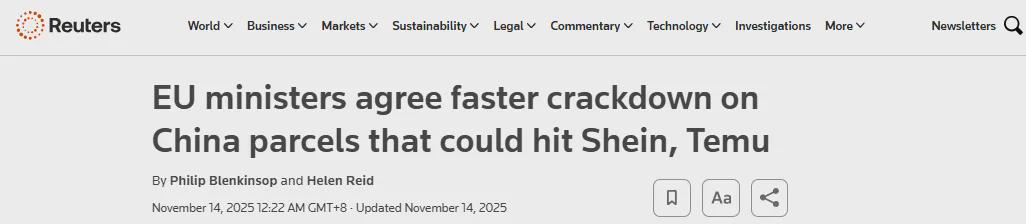 近期,欧盟成员国曾敲定一项重磅新规:自2026年起,所有进入欧盟的150欧元以下进口小包裹将不再享受关税豁免。