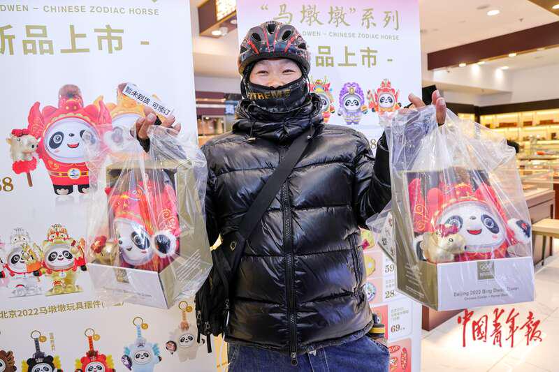 11月28日,北京王府井工美大厦,一位快递小哥一大早便在门前排队等候,购买了许多“马墩墩”产品。他告诉记者,这是客户在线上下的代购订单,许多人无法来到现场,便通过代买的方式购买。中青报·中青网记者 陈思阳/摄
