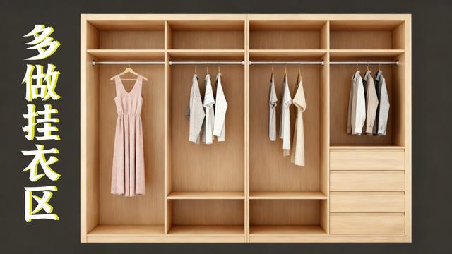 在设计衣柜时,应最大化挂衣区的比例,并为长衣(连衣裙、大衣)和短衣(上衣、裤子)设置不同高度的区域。叠放区仅作为补充,用于收纳毛衣、床品等不易皱、不常用的物品。