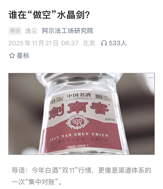 文章指出,今年双十一期间,平台的补贴力度不同往年,呈现出力度更深的降价态势。而这一变化,在“长期稳健、渠道流通性颇佳”的剑南春核心大单品水晶剑身上,表现得尤为明显。