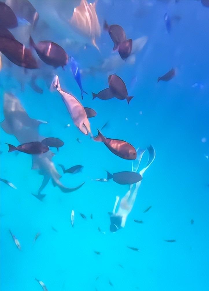 到后面第三次下水,女子直接站到了鱼群中央,甚至开始追赶前面的鲸鲨,周围的鱼挺多的,这个时候还没有什么攻击性。