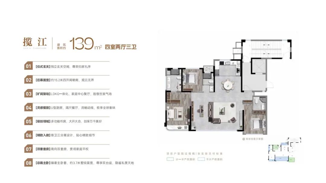 建面约139㎡户型,南向面宽达到约15.2米,直接越级至温州少有的大平层格局。更大空间自然就有更多的功能选择和更体面的待人接物的排场,对于好客的温州人而言很是重要。