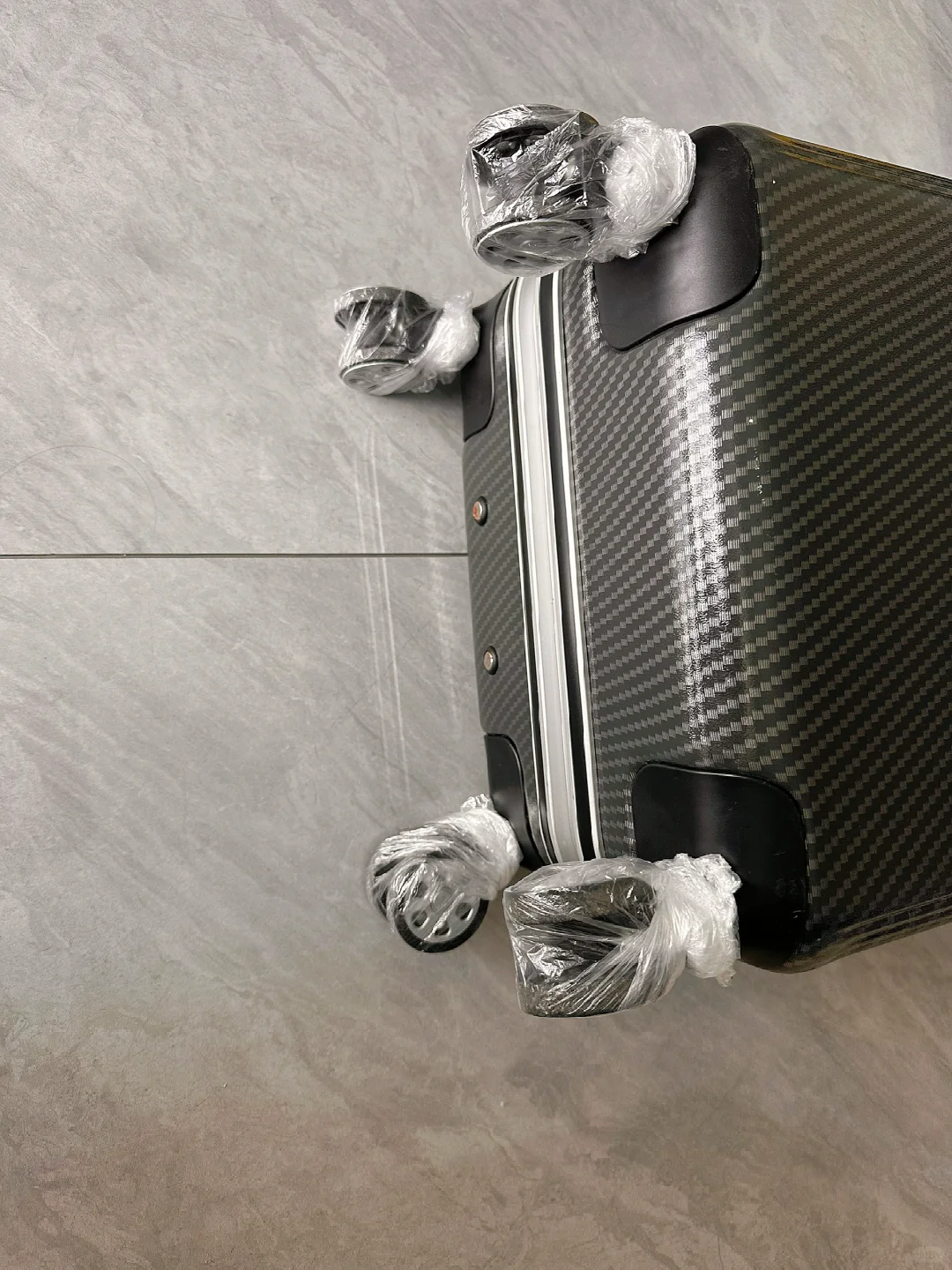 其实根本不用这样麻烦,你可以将家里的保鲜膜套取出来。直接套在行李箱的轮子上,然后在封口的地方系紧就可以了,这样行李箱可以直接放进柜子里,不用担心会弄脏柜子。