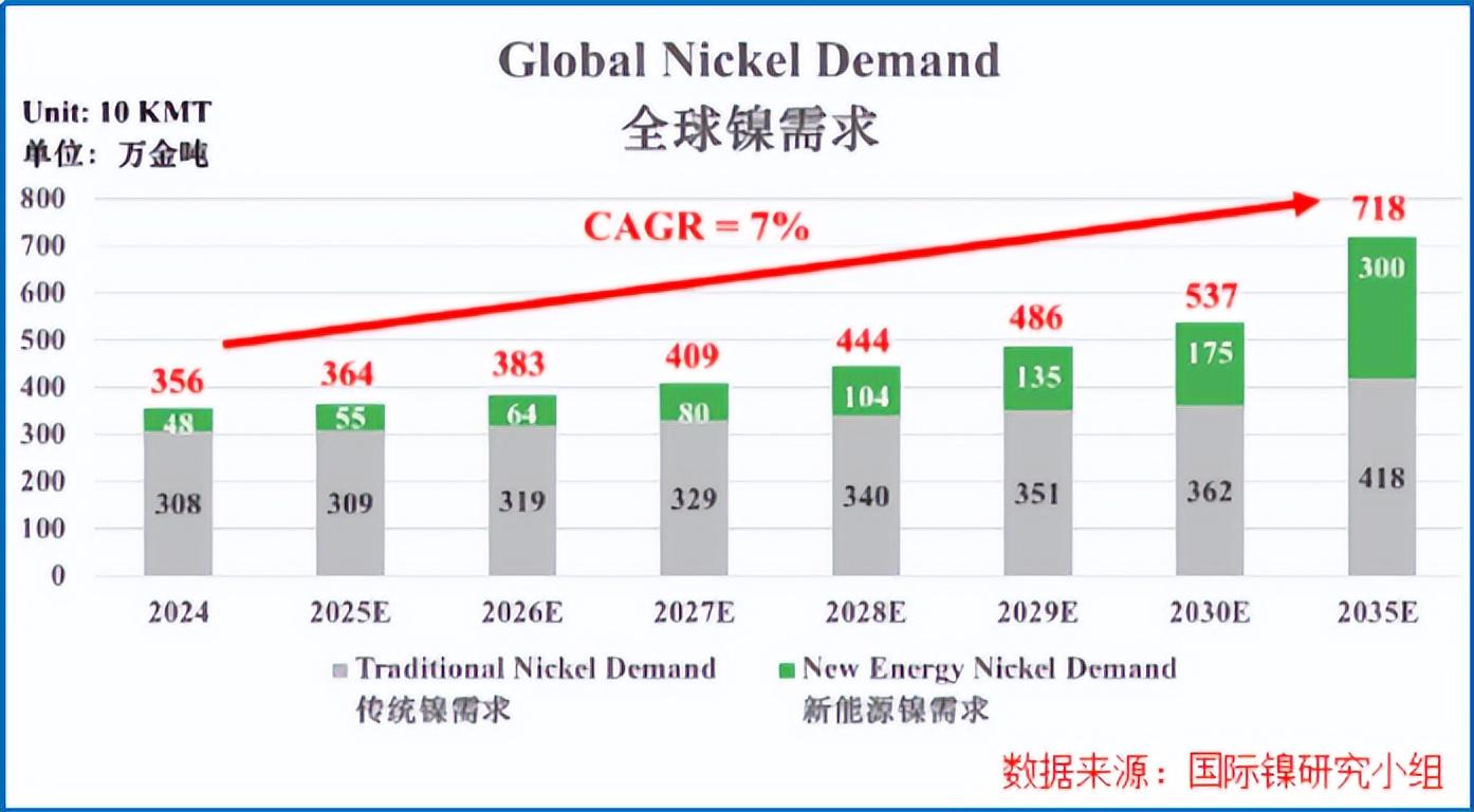 根据机构预测,到2035年预计全球镍需求将达718万吨,未来十年的年复合增速高达7%。