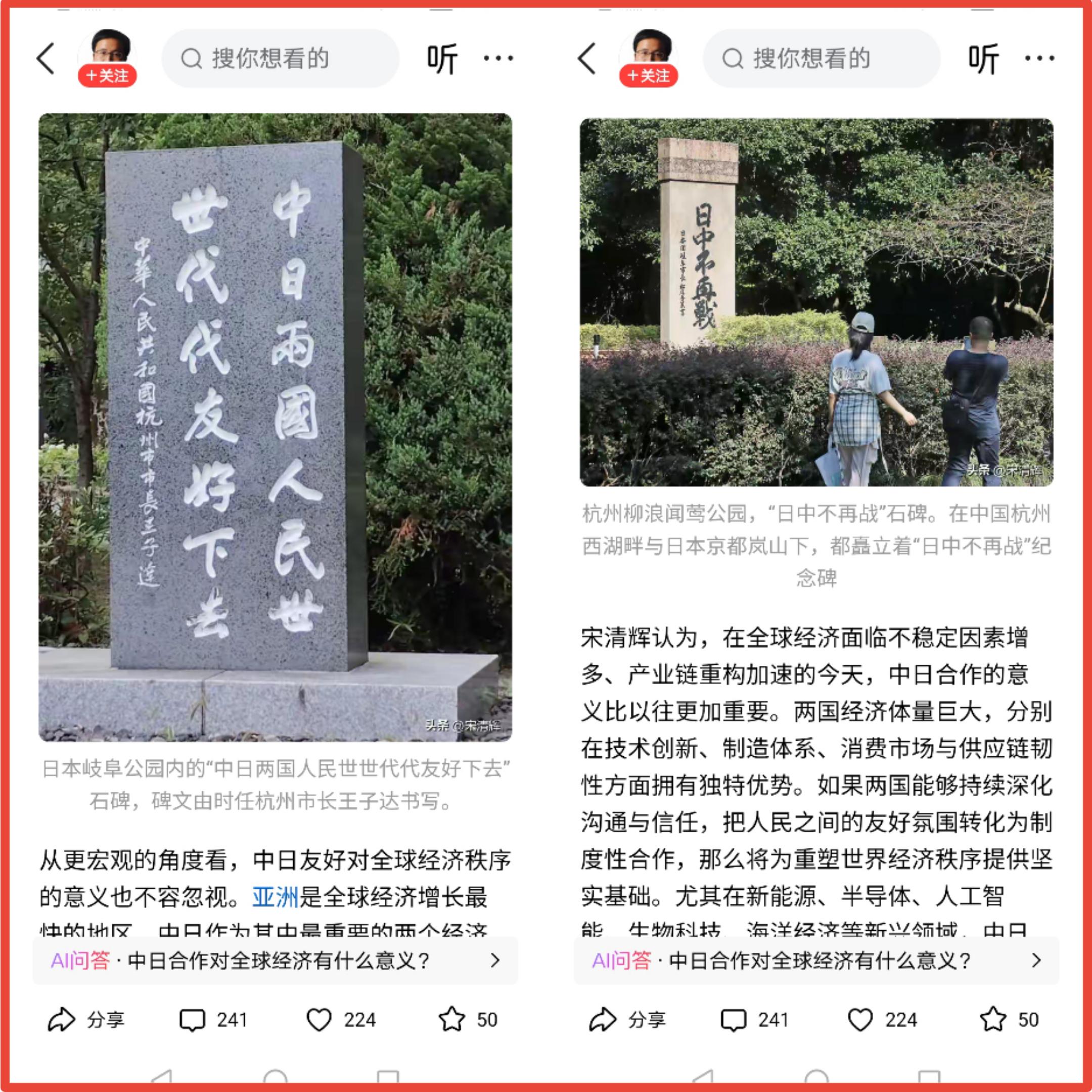 宋清辉在文章里说了中日经济上密切联系,说了和平对于两国人民的好处,还说了中日各有一块碑表达中日友好、不再战争的美好愿望。可是,现在情况变了。