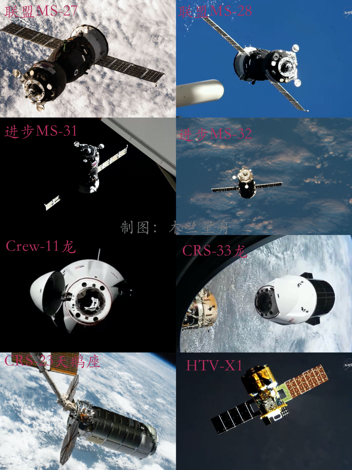 当前,国际空间站停靠的8艘飞船分别为来自俄罗斯的“联盟MS-27”载人飞船、“联盟MS-28”载人飞船、“进步MS-31”货运飞船(“进步92”)、“进步MS-32”货运飞船(“进步93”),来自美国的Crew-11“龙”载人飞船、CRS-33“龙”货运飞船、CRS-23“天鹅座”货运飞船(“天鹅座23”),来自日本的HTV-X1货运飞船。