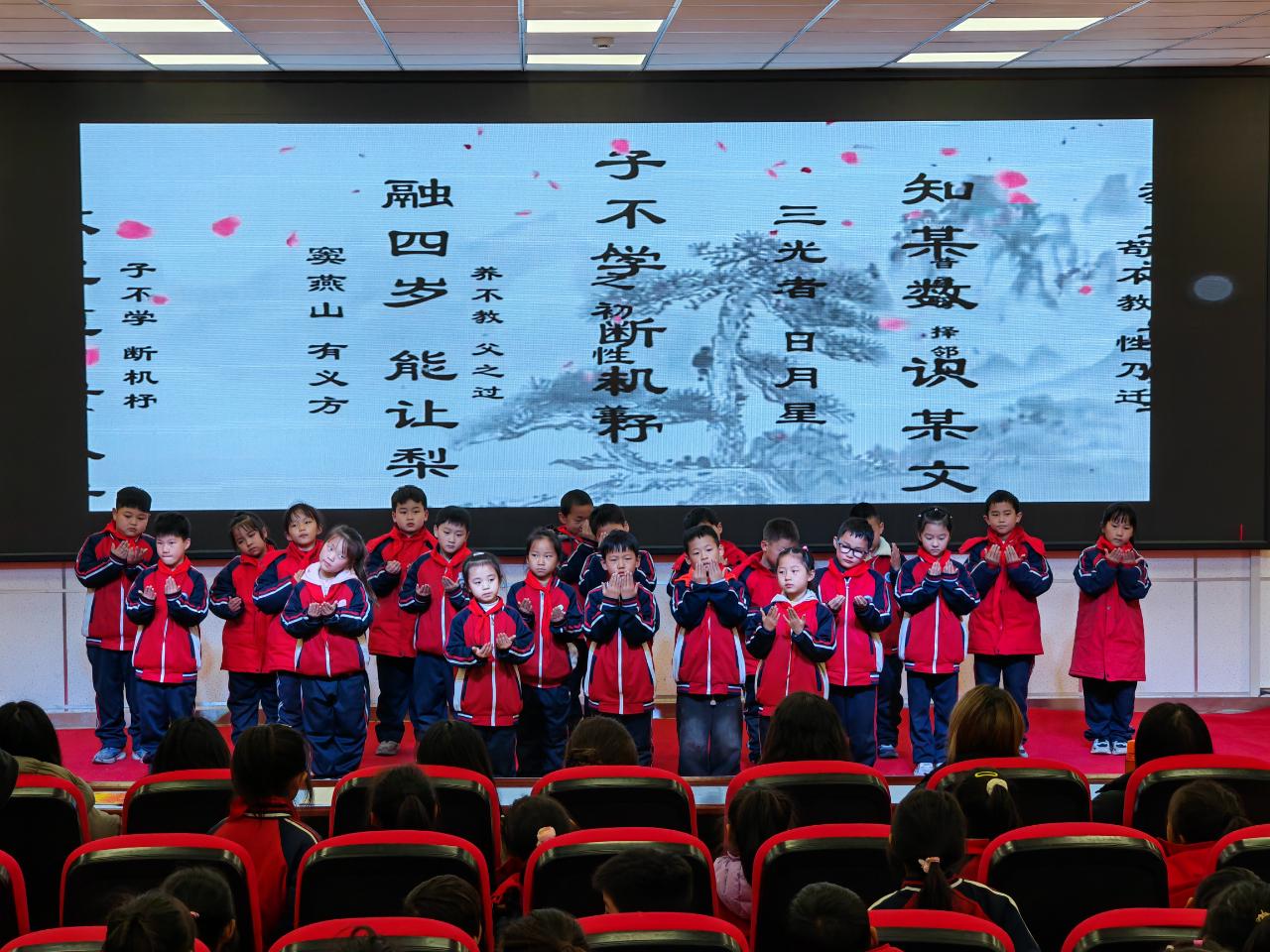 展演中,孩子们精神饱满、着装整齐。诵读《三字经》时,齐诵与轮诵交替,字字铿锵;《笠翁对韵》的对答环节朗朗上口,尽显汉字韵律之美。《论语》诵读时,情景演绎与名句齐诵交织,句句入心;对话互动与分组轮诵交替,声声传情;演绎古诗时,搭配配乐与简单肢体动作,让诗句意境生动可感,部分班级融入舞蹈、歌唱等创新元素,赢得阵阵掌声。