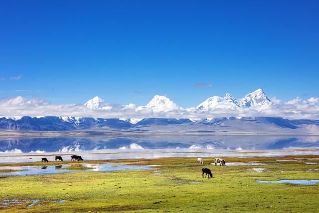 走到湖湾深处的观景台时,阳光愈发炽烈,湖水的颜色也变得愈发浓郁,从浅蓝到深蓝渐变,如一块巨大的蓝宝石。几位摄影爱好者正举着相机拍摄,镜头追着掠过湖面的水鸟,生怕错过这灵动的瞬间。扎西从藏袍里掏出几个糌粑团:“家里做的,就着湖水吃最香。”糌粑的粗糙纹理中藏着酥油的香气,在舌尖慢慢散开。不远处的草甸上,几只牦牛正悠闲地啃草,黑色的身影与蓝色的湖水形成鲜明对比。