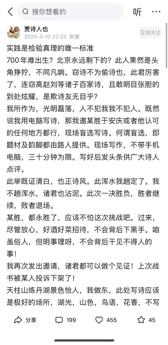 所以这次“ ‘@卧龙村116’ ”网友指出“ “ ‘@北平永胜’” ” 的(无论是“@新北平永胜”还是吸烟与否都不知道的“**国”老师如其他账号,“@诗词判官”或者“‘@打假AI电脑诗专用号’” 等等其他账号形式出现的异常现象。) 要求他人不要在“贾诗人也 ”评论区进行评论,我一点也不奇怪!“@贾诗人也 ”至今可能也不明白为何此人一直咬着此人不妨直言的地方在于:此人很喜欢封杀或者禁言他人,总之如果找不到错,肯定也有理由。