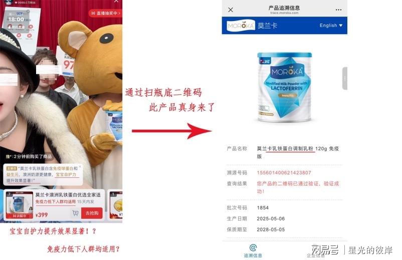 据刘江介绍,该产品在直播推广时,明确以“免疫球蛋白”、“乳铁蛋白”为核心营销点,明确宣称可满足婴儿、成人、孕妇及老人等不同人群需求,凭借“全年龄段适用”的宣传点吸引大量消费者下单。但收货后刘江发现,该产品实质为普通食品调制乳粉,与直播宣传的“专属营养品”属性存在明显差异。更值得关注的是,通过翻译产品英文说明发现,其中明确标注"本品不适合作为3岁以下儿童的完整奶制品食品,且应放置在儿童接触不到的地方",这与直播中"全年龄段适用"及以夸张表述暗示"可预防婴幼儿疾病"的宣传内容相悖,已涉嫌误导消费者。