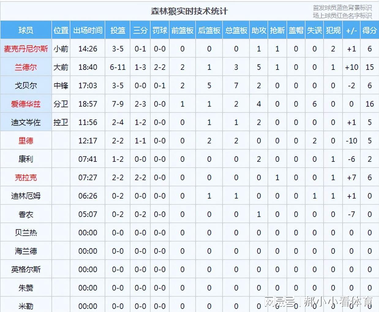 森林狼方面,爱德华兹拿下16分2篮板4助攻;兰德尔得到15分3篮板5助攻,内外兼修。