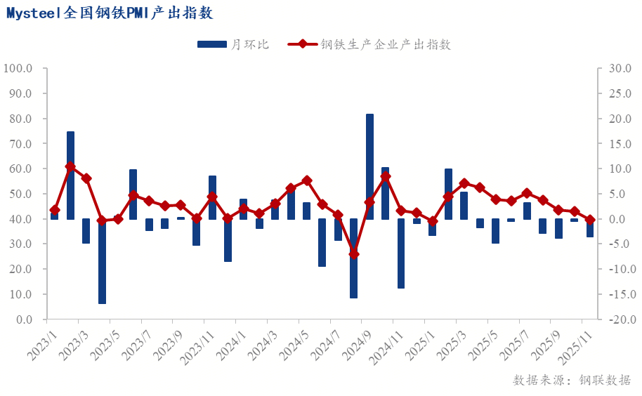 2025年11月,全国钢铁行业PMI为45.6,较10月的46.2再降0.6个百分点,继续位于收缩区间,表明行业整体活动水平较上月进一步走弱。分项指标看,产出指数回落至39.5,较10月下滑3.6个百分点,生产收缩明显加剧;新订单指数升至45.3,较上月小幅回升1.1个百分点,但仍低于荣枯线,需求修复力度有限。成品材出厂价指数大幅升至59.3,较10月的38跳升21.3个百分点,价格指标由明显收缩转为显著扩张,与终端需求偏弱形成一定错位。新出口订单指数为45.7,较上月小降0.7个百分点,外需仍处收缩区间。综合来看,11月钢铁行业特征为:生产端收缩加深、内需边际改善、外需继续承压、成本高位震荡,价格企稳更多依赖成本支撑与供给收缩,而非需求实质回暖。