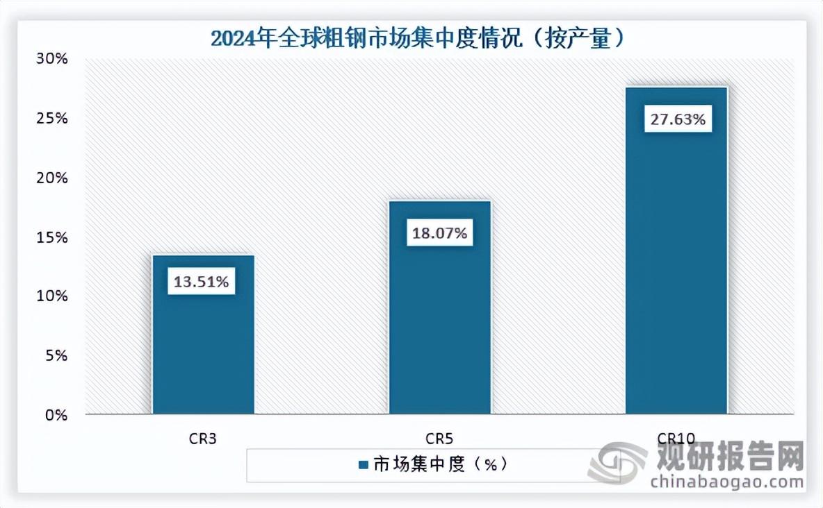 从市场集中度来看,在2024年全球粗钢行业CR3、CR5、CR10市场份额占比分别为13.51%、18.07%、27.63%。