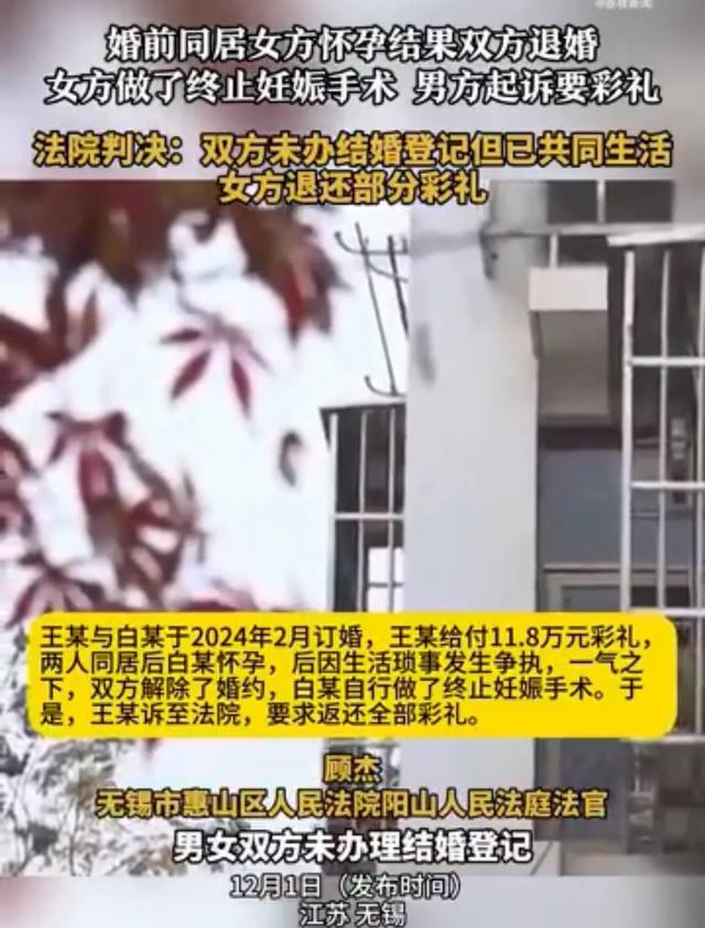 12月1日(发布),江苏无锡。王某与白某于2024年2月订婚,王某给付11.8万元彩礼,两人同居后白某怀孕,后因生活琐事发生争执,一气之下,双方解除了婚约,白某自行做了终止妊娠手术。于是,王某诉至法院,要求返还全部彩礼。法院审理认为,双方未办结婚登记但已共同生活,且女方有妊娠经历,仅因未登记要求全额返还彩礼有违公平原则。法院综合考虑共同生活、孕育情况及当地习俗,判决白某返还王某 47000余元。(荔枝新闻)