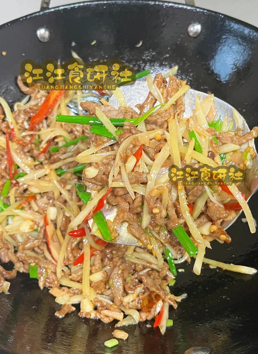 3、热锅冷油滑散牛肉丝,变色即盛出;余油爆香仔姜丝。