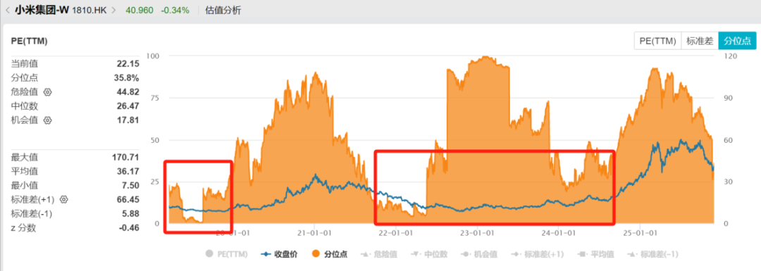从当前估值的角度看,小米的估值为22.15倍,处于近10年35.8%分位线。