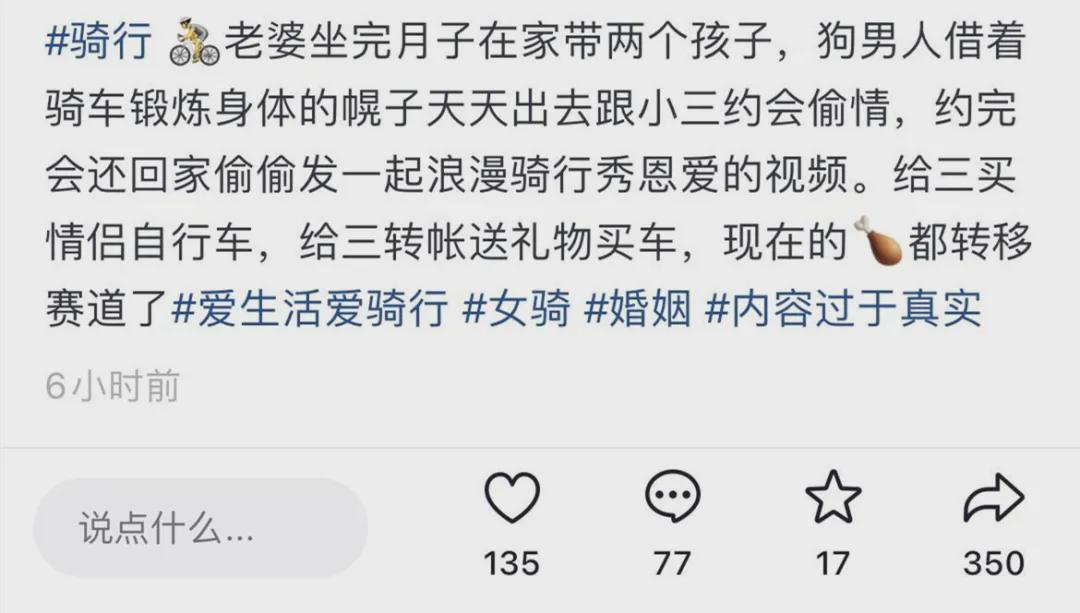 乐清一女骑者破坏他人家庭,为何还这么嚣张?竟发文炫耀对方5月给买情侣自行车、骑行服,7月买金项链,嘲讽原配挑男人眼光差,管不住男人和财产,生娃带娃、洗衣做饭全包,却啥都没得到,十分可怜。
