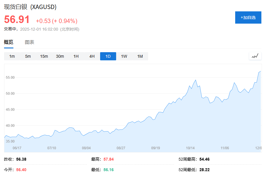 12月1日周一,现货白银价格史上首次突破每盎司57美元,日内涨约1%。而纽约商品交易所的白银期货也触及每盎司57.81美元的新高。