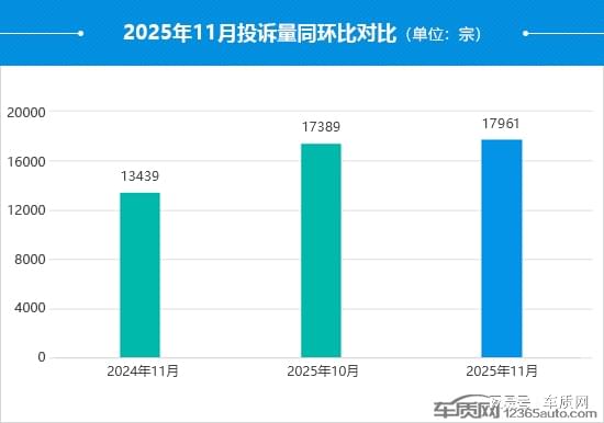 据国内领先的缺陷汽车产品信息收集和汽车消费者投诉信息受理平台车质网统计,2025年11月共受理车主有效投诉信息17,961宗(其中含第三方平台和后装轮胎投诉共43宗),环比上涨3.3%,同比上涨33.6%。今年1-11月累计投诉量创纪录地突破20万宗,较去年同期上涨32.3%。