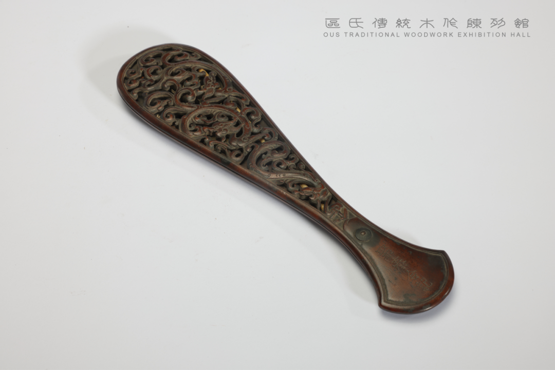 本馆这件清前期制作的戥子盒,它的外形如琵琶般优美,制作精良。盒面上透雕螭龙纹,螭龙神态生动,龙尾与四足被巧妙地设计成圆婉的卷草形态,线条流畅,雕刻技艺细腻,尽显古代木雕的精湛技艺,做法殊为罕见。