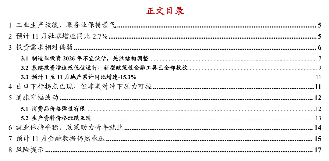 11月工业生产景气有所改善,我们预计11月规模以上工业增加值同比增速或为5.3%。一方面,工业稳增长着力于装备制造业,新动能发力稳增长;另一方面,制造业外需修复快于内需,中美经贸磋商达成主要成果共识降低国际贸易不确定性,有利于修复和稳定企业生产预期。工业稳增长政策稳增长与促转型、“反内卷”相结合,有助于制造业新动能相关产业生产积极。受假期效应消退等因素影响,11月服务业景气有所放缓。