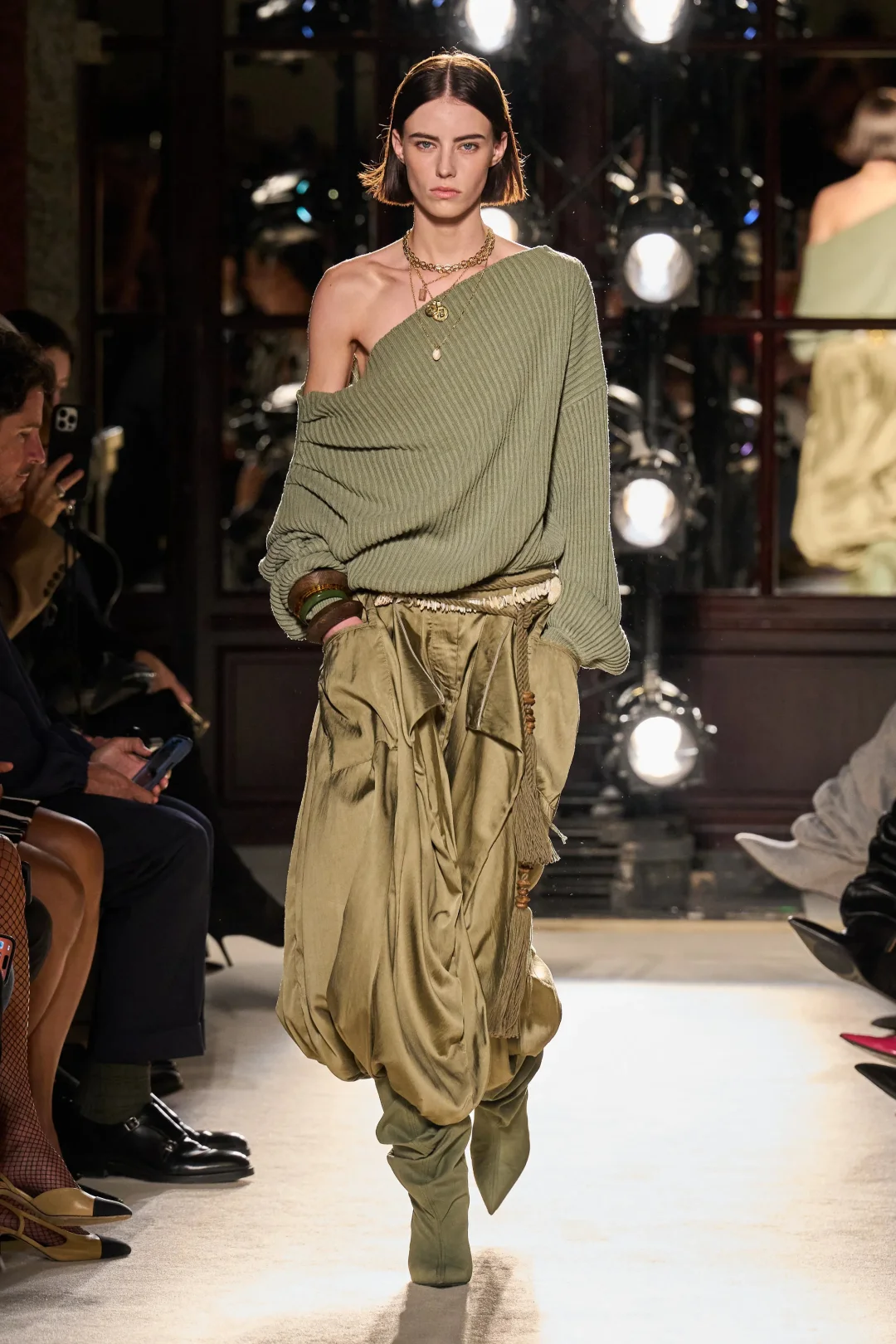 落肩设计的皮革外套延续八十年代的慵懒,解构主义的丝缎长裙以不对称剪裁展现随性之美。流线型长裙搭配细肩带,皮质工装短裤以海军蓝绳腰带点缀,六十年代风格的针织衫与随性飞行员夹克相映成趣。