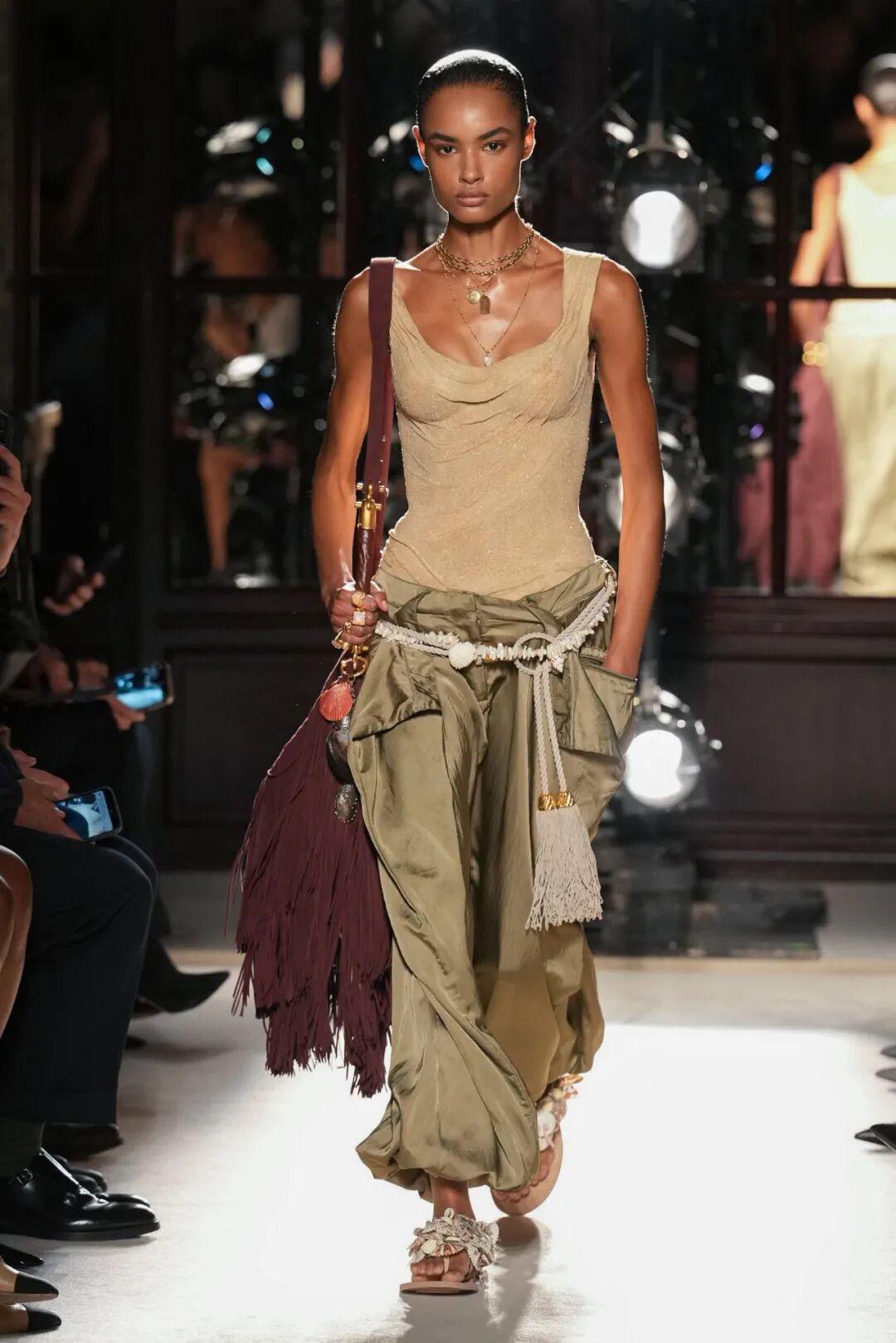 新系列,设计师摒弃了Balmain标志性的锋利肩线与紧身剪裁,转而以流动的廓形(如灯笼裤、茧型针织衫)和柔美曲线(垂坠丝缎长裙、解构主义罩衫)重塑品牌基因。这种转变不仅是剪裁的革新,更是对“自然游牧风”的致敬——模特们仿佛从海浪中走来的旅人,衣袂间流淌着未被驯服的野性诗意。
