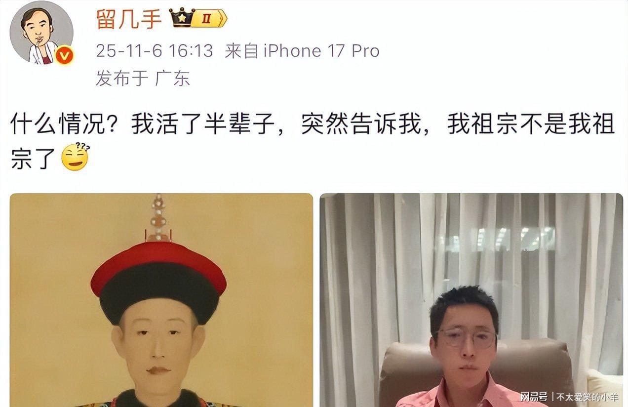 而留几手最近比较有意思的另一件事则是,近日有知识博主称康熙并非正统血脉,而是洪承轁私生子。这让一向爱钦觉罗后人自居的留几手破防,直言活了半辈子,祖宗不是自己祖宗了。网友们也是纷纷留言调侃。