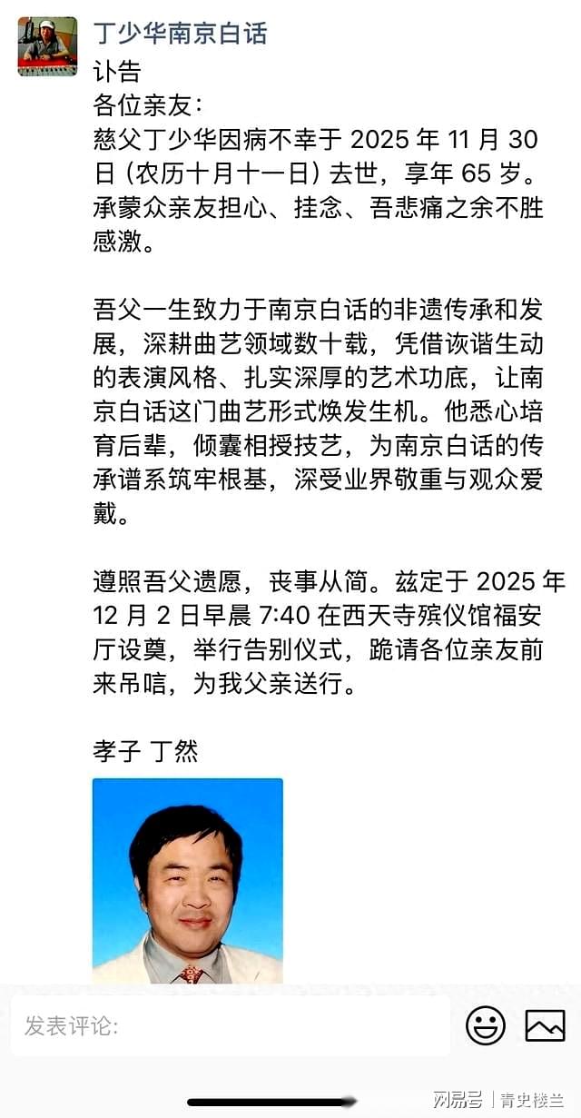就在那个点点滴滴的时刻,丁少华老师的去世宛如一场突如其来的雷击,把南京白话的香火瞬间骤然熄灭了。消息一出,朋友圈、微博、抖音都炸了锅。微信朋友圈里,朋友们纷纷发出哀悼,有的还调侃着“白话江湖再无一人独持江湖扇。”有人专门说:“丁老师走得太突然了,像他生前那样,笑中带泪,毫不张扬,却能直击人心。”这情感的共鸣,看来不仅仅是表面上的哀悼,更有一种对传统文化殉道者的敬意。这种敬意,像是一股深藏在心底的情感,没人说出口,却都在默默缅怀那份守护之心。