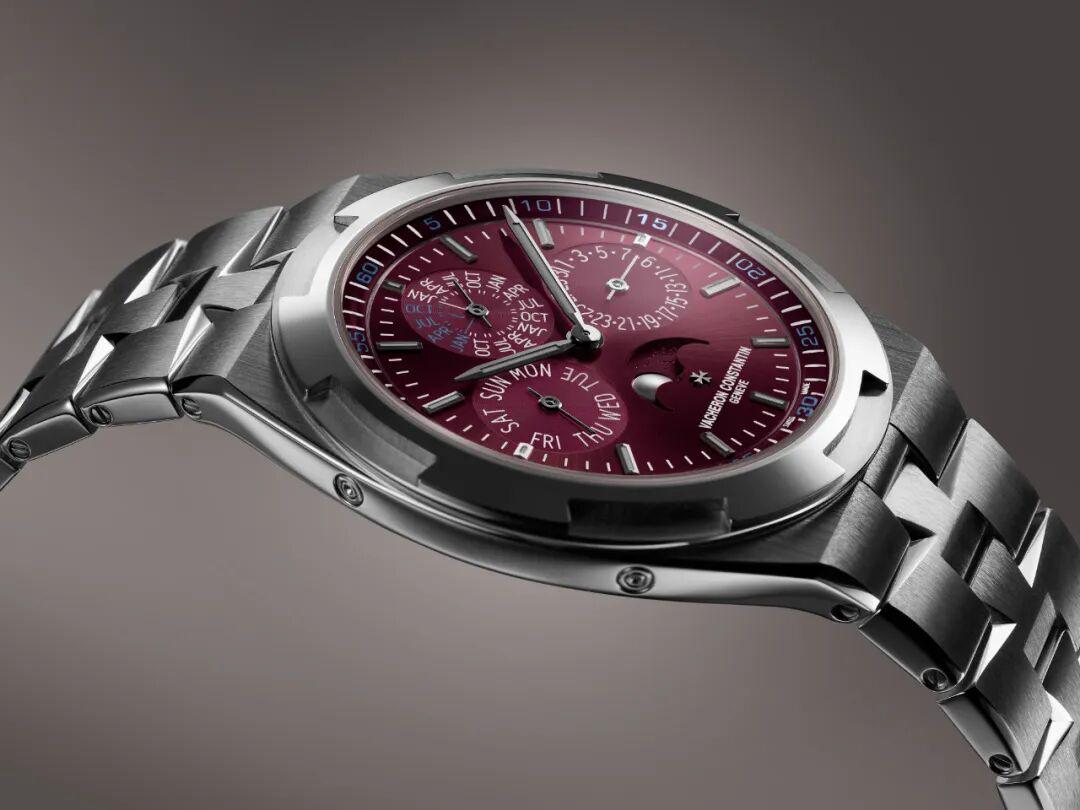 第一款是白金表壳,搭配勃艮第红色调漆面表盘,呈现出独特的对比美感。