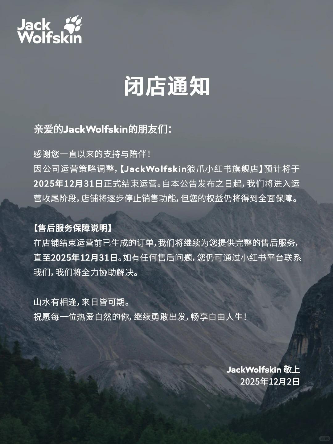 因公司运营策略调整,【JackWolfskin狼爪小红书旗舰店】预计将于2025年12月31日正式结束运营。自本公告发布之日起,我们将进入运营收尾阶段,店铺将逐步停止销售功能,但您的权益仍将得到全面保障。