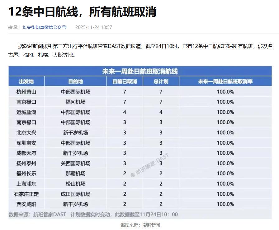 据《日经亚洲》11月29日报道,中国航空公司12月已取消赴日航班904架次,是两天前的三倍,波及东京成田、大阪关西等13个机场。