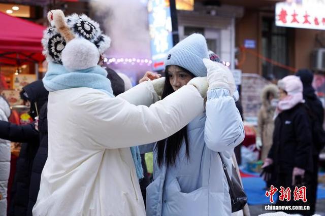 12月2日,黑龙江哈尔滨,游人试戴保暖物品。当日,黑龙江哈尔滨最高气温今冬首次降到-10℃以下 ,在哈尔滨红专街早市,棉帽子、大花袄等保暖物品摆上街头,游人纷纷选购。中新社记者 赵宇航 摄