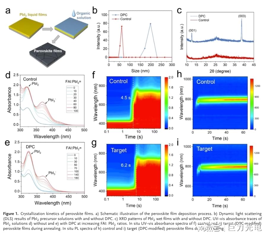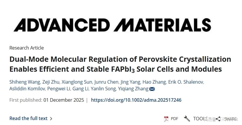 有机-无机杂化钙钛矿太阳能电池(PSCs)是最具潜力的光伏技术之一,但结晶过程的不可控性会导致薄膜形貌不均、缺陷密度偏高,成为制约其性能提升的核心瓶颈。对此,郑州大学张懿强教授团队开发了一种新型双功能分子调控策略,创新性引入碳酸二苯酯(DPC)作为分子调节剂,实现了甲脒铅碘(FAPbI₃)钙钛矿结晶成核与生长过程的同步精准调控。