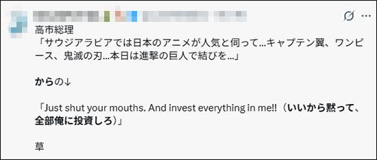 在日本国内,这事儿也炸开了锅。有人就在网上吐槽:“岸田、安倍他们当年喊‘投资安倍经济学’,好歹还说得过去。高市呢?直接让人家闭嘴,把钱都给她!” 还有网友说,日本那么多好好的动漫,比如《海贼王》、《鬼灭之刃》、《足球小将》,她偏偏挑了《进击的巨人》,这脑回路,真够清奇的!