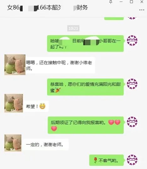 近期,红娘老师也收到了不少会员的脱单喜讯,我们来给大家分享一下这些好消息,来沾沾喜气吧~