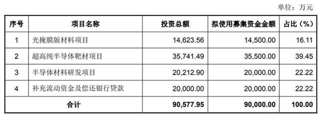 9 亿元资金将精准投向四大方向:超高纯半导体靶材项目拟使用 3.55 亿元,占比 39.45%;半导体材料研发项目拟投入 2 亿元,占比 22.22%;光掩膜版材料项目拟使用 1.45 亿元,占比 16.11%;补充流动资金及偿还银行贷款 2 亿元,占比 22.22%。在募集资金到位前,公司可自筹资金先行投入募投项目,后续再予以置换。