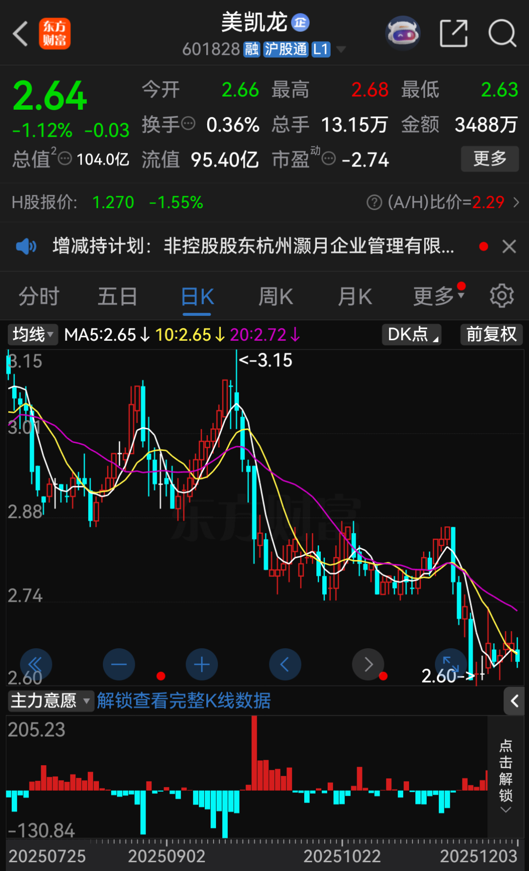 截至12月3日收盘,美凯龙A股股价报2.64元/股,下跌1.12%,总市值为104亿元。